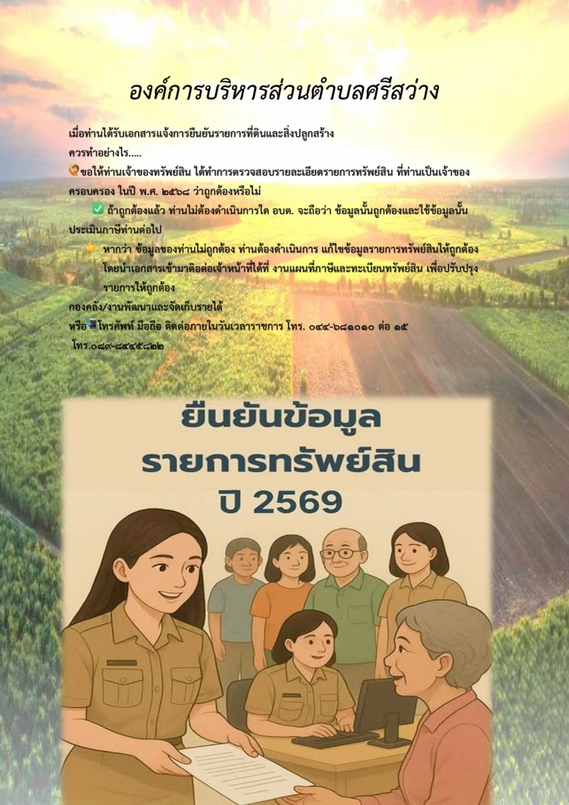 เมื่อท่านได้รับเอกสารแจ้งการยืนยันรายการที่ดินและสิ่งปลูกสร้าง ควรท าอย่างไร..... ขอให้ท่านเจ้าของทรัพย์สิน ได้ท าการตรวจสอบรายละเอียดรายการทรัพย์สิน ที่ท่านเป็นเจ้าของ ครอบครอง ในปี พ.ศ. 2568 ว่าถูกต้องหรือไม่ ถ้าถูกต้องแล้ว ท่านไม่ต้องด าเนินการใด อบต. จะถือว่า ข้อมูลนั้นถูกต้องและใช้ข้อมูลนั้น ประเมินภาษีท่านต่อไป หากว่า ข้อมูลของท่านไม่ถูกต้อง ท่านต้องด าเนินการ แก้ไขข้อมูลรายการทรัพย์สินให้ถูกต้อง โดยน าเอกสารเข้ามาติอต่อเจ้าหน้าที่ได้ที่ งานแผนที่ภาษีและทะเบียนทรัพย์สิน เพื่อปรับปรุง รายการให้ถูกต้อง กองคลัง/งานพัฒนาและจัดเก็บรายได้ หรือ โทรศัพท์ มือถือ ติดต่อภายในวันเวลาราชการ โทร. 044-681010 ต่อ 15 โทร.089-8445822