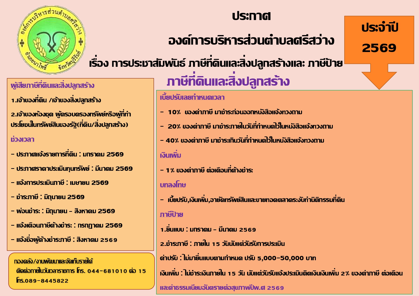 ประชาสัมพันธ์ การชำระภาษีที่ดินและสิ่งปลูกสร้างและภาษีป้าย ประจำปี 2569