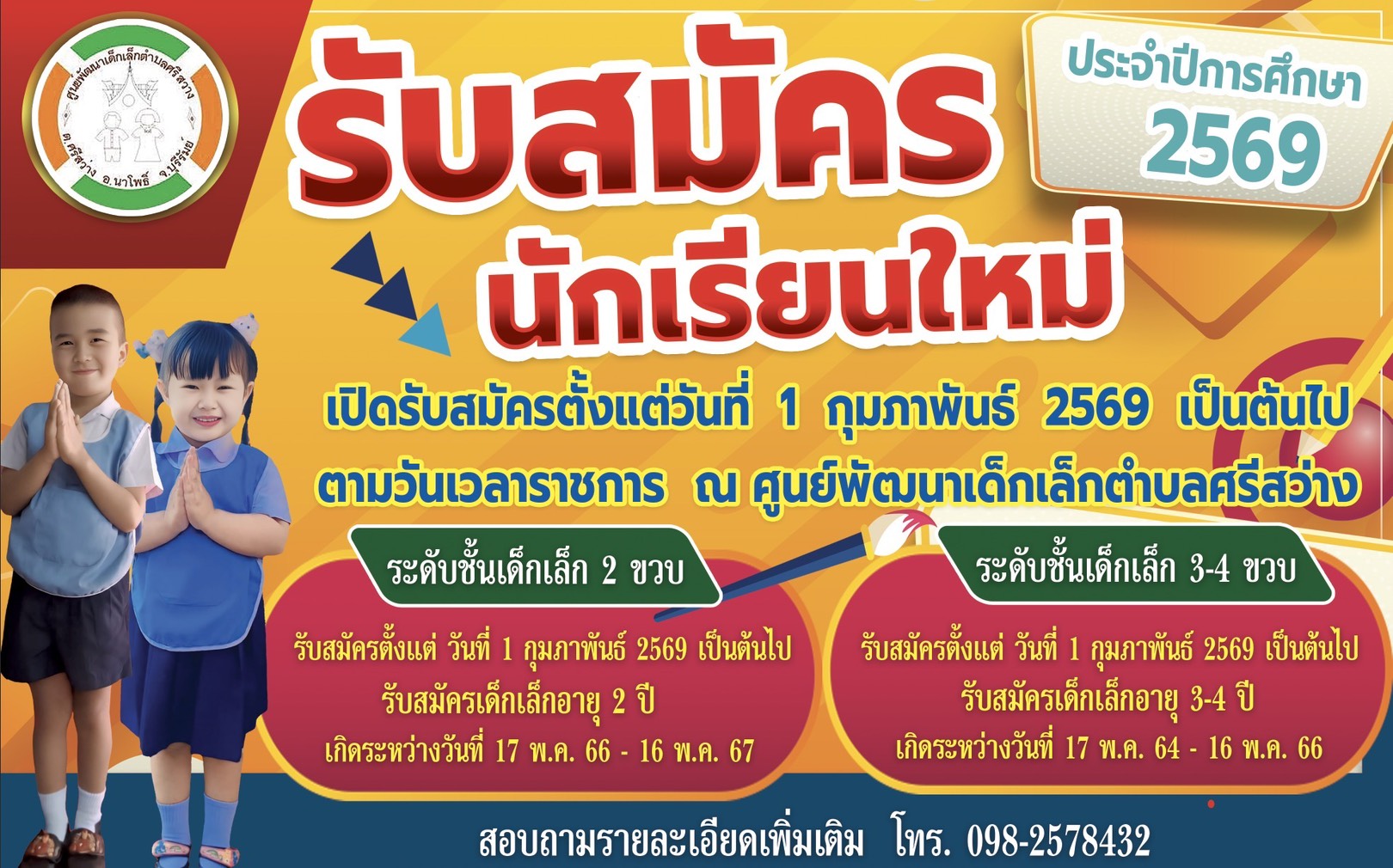 ศูนย์พัฒนาเด็กเล็กตำบลศรีสว่าง รับสมัครนักเรียนใหม่ตั้งแต่วันที่ 1 ก.พ. 2569 เป็นต้นไป